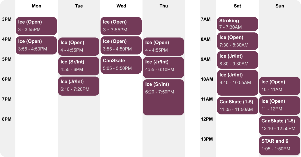 We offer the STARSkate program which is a figure skating program(StarSkate) and CanSkate program for beginners. You can also register for private or semi-private lessons (children ages 4+). For more information, see Our Private & Semi-Private lessons